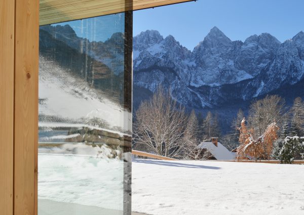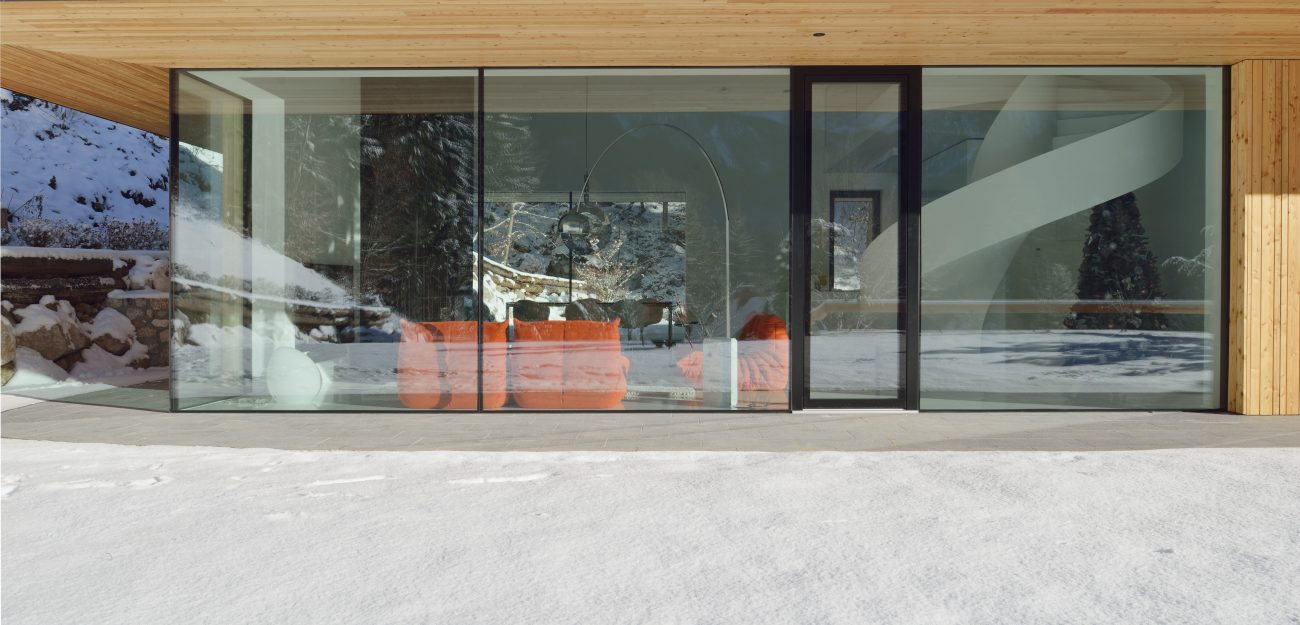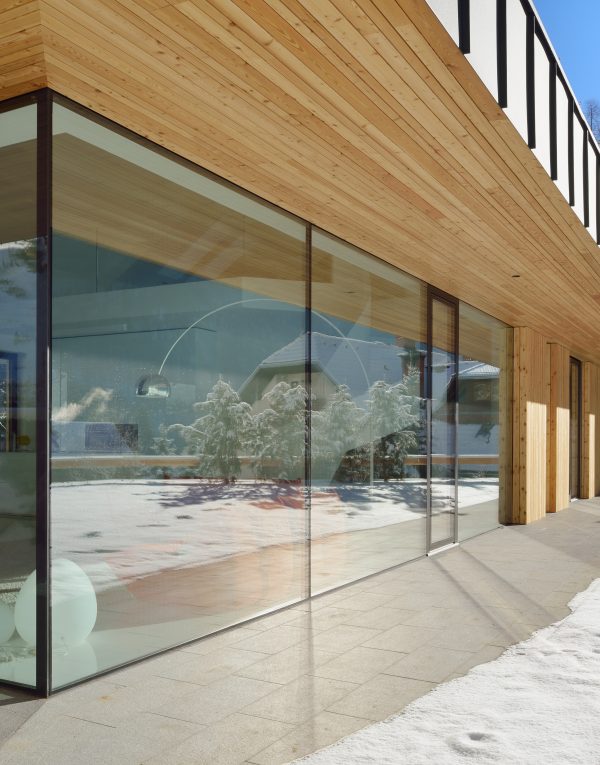 Fenster mit Glasaußenfläche: Holz ist hinter Isolierglas mit emailliertem Rand verborgen. Minimalistische Fassade, hohe Dichtheit und Stabilität auch bei großen Formaten.