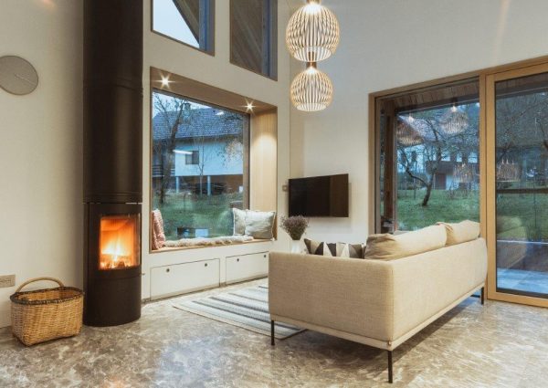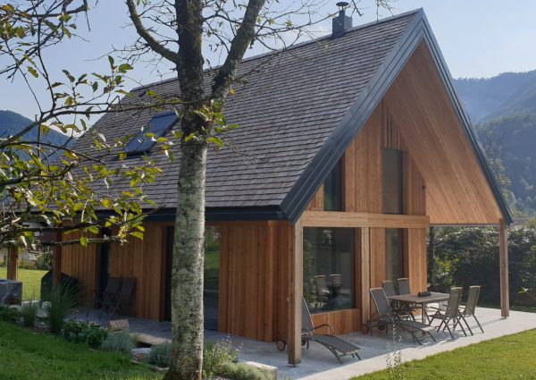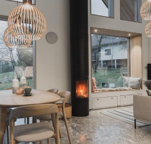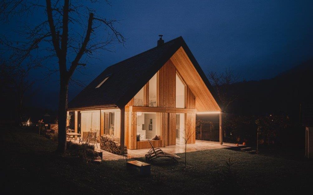 In der Kosteljska bedeutet „Bale, bale“ „Komm, komm“. Das Häuschen lädt schon mit seinem Namen zum Komfort der Natur ein, von dem es umgeben ist. Es wurde modern gebaut, jedoch mit Berücksichtigung des lokalen kulturellen und architektonischen Erbes. Die Bedachung ist eine dreischichtige Bedachung aus Lärchenholz, die Fassade ist mit vertikalen Leisten aus Lärchenholz durchlüftet. Das Objekt schwebt über einem steinernen Sockel aus Marmor aus Hotavlje. Der zentrale offene Raum ist 7,5 m hoch und bietet einen wunderschönen Blick auf die Kuželjska stena. Das Hauptelement des zentralen Raums ist ein schwarzer Kamin. Im Inneren des Hauses wurde als Grundmaterial massives Eichenholz verwendet. Der Esstisch die Stühle und der kleine Klubtisch zeigen die genaue Verarbeitung der Tischlermeister mit Betonung der Beständigkeit und Mächtigkeit der Eiche Das Haus befindet sich in der Kočevje. (Foto: Nik Grmovšek)
