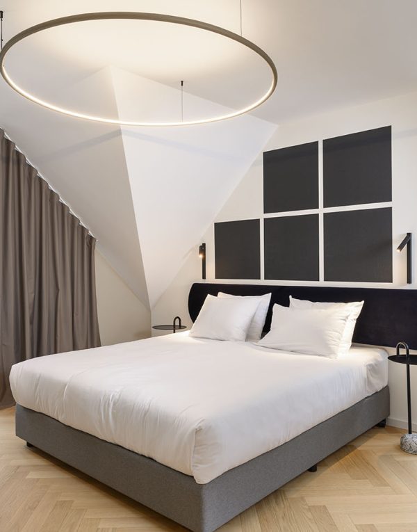 Das Objekt wurde so entworfen, dass der zugelassene Garbarit in größtem Maße ausgenutzt wird. Die Verschiebung der Halbetage und der durchdachte Grundriss ermöglichen die Anordnung von 18 Hotelzimmern, davon 2 Suiten mit Loge und 2 Appartements in der Mansarde. Die Serviceräume sind im Keller, während im Erdgeschoss das öffentliche Programm mit der teilweise inkludierten Rezeption und dem Kaffeehaus im Garten stattfindet. Die Inspiration bei der Erforschung des konzeptionellen Entwurfs der Fassade war eine märchenhafte Verflechtung von Schatten und Sonne sowie sichtbare Holzkonstruktionselemente in Villen im benachbarten Rožna dolina. (Foto: Miran Kambič)