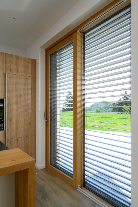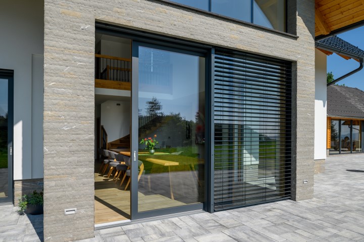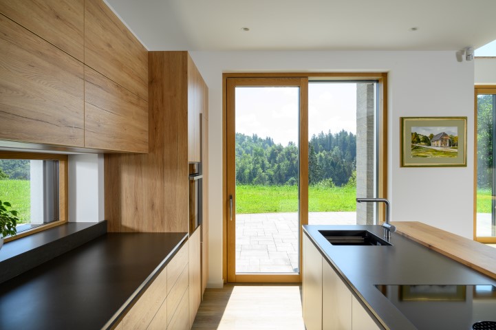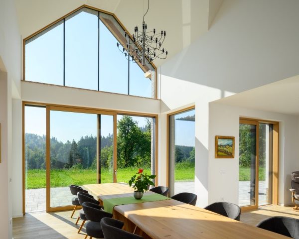Die Eigentümer wünschten sich auf der einen Seite eine Architektur, die möglichst der Gebäudebautradition in der Umgebung angenähert ist, auf der anderen Seite wünschten sie sich aber eine Öffnung hin zu einem einzigartigen Ausblick auf die Wiesen und Wälder in der Umgebung. Wunderbare Ausblicke entstehen durch die großen Verglasungen und die verschiebbaren Hebeschiebetüren. Die Fensterrahmen aus Eichenholz sind im Inneren sichtbar und umrahmen schön die grünen Schattierungen der Natur, an der Außenseite sind sie durch das Aluminium in der Farbe Anthrazit, die sich perfekt mit der ausgewählten Bedachung verbindet, vor witterungsbedingten Einflüssen geschützt. (Foto: Miran Kambič)